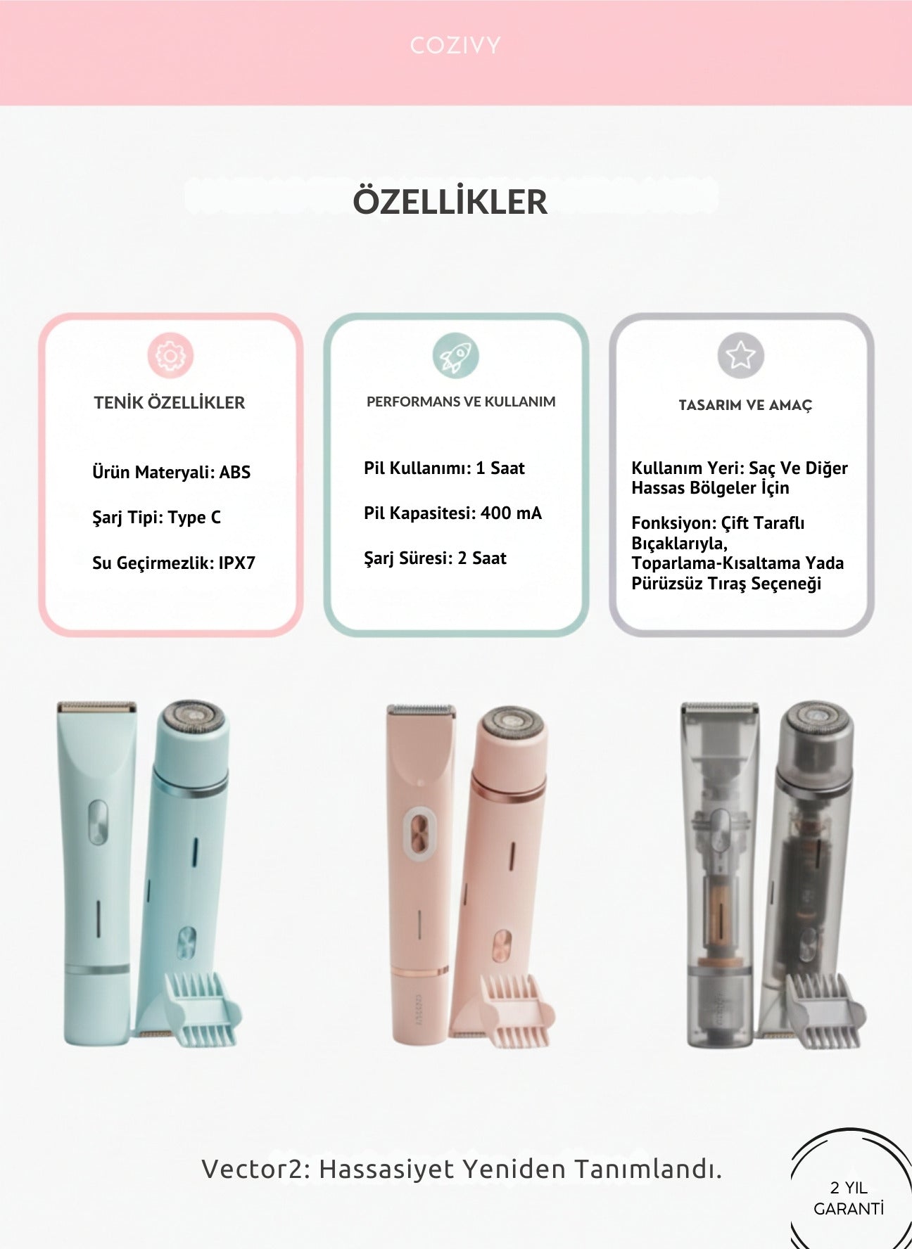 Cozivy, cildi tahriş etmeden pürüzsüz bir tıraş sağlayan, ergonomik tasarıma sahip şarjlı bir tıraş makinesidir. Hassas bıçak teknolojisi sayesinde ciltle doğrudan temas etmeden kıl köklerini alır.